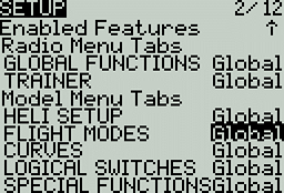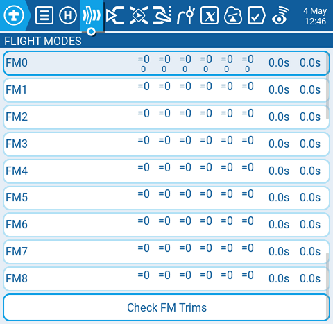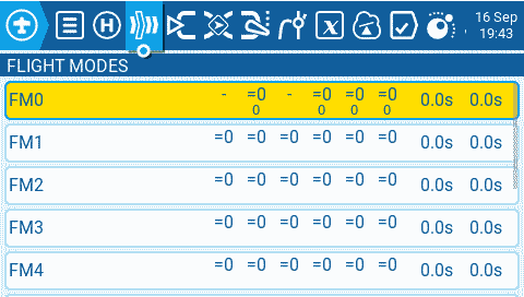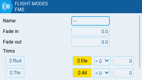 Step 1: Disable the trims for rudder and throttle which are not needed. Then we can reuse them for other functionality. Enter the model menu and navigate to the Flight Modes page. Edit FM0 and disable the Throttle and Rudder trims. The yellow highlight color will be gone when the trims are disabled.