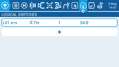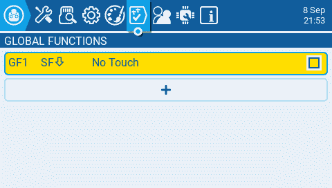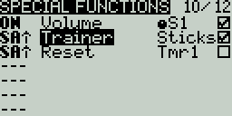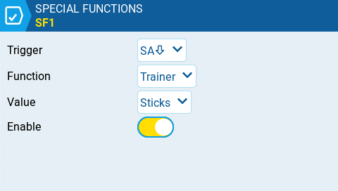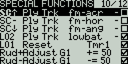 Press the [MDL] button to open the Model Setup screen and navigate to Special Functions Tab and create a new Special function with the following configuration.