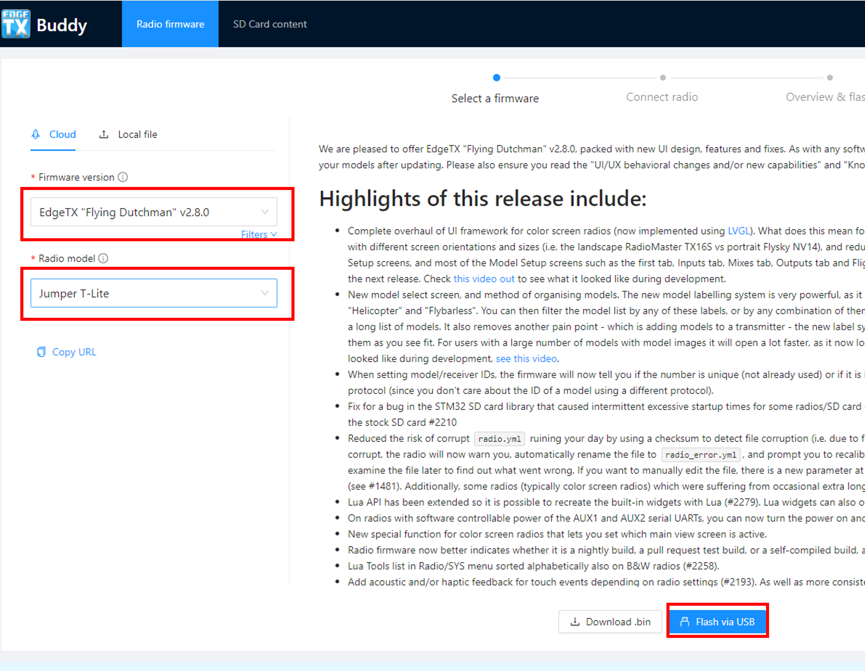 На левой панели из списка выберите Firmware version (Версия ПО) и Radio model (Модель радио, т.е. вашей аппаратуры), затем нажмите на подсвеченную кнопку Flash via USB (Прошивка через USB).